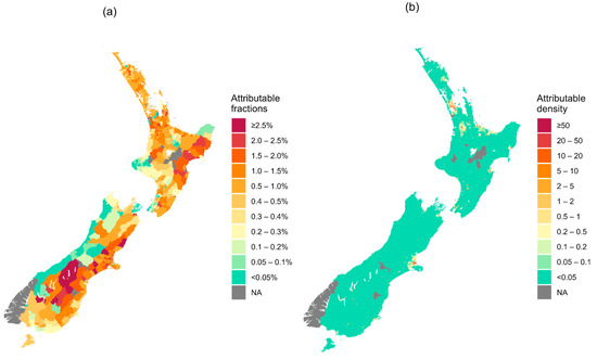 Spatial patterns of the attributable density (AD) showed a different variation across SA2s, with a mean of 7.1 admissions per 10 km2 and a median of 1.8. AD was highest in the populated areas (Figure 5b). Some SA2s had particularly high ADs, including areas in the North Island: Hawke’s Bay Region (Lochain Park 130.1, Flaxmere South 126.3, Flaxmere West 122.1, Maraenui 72.5, Camberley 66.6), Waikato Region (Crawshaw 97.4, Swarbrick 94.3, Enderley North 79.6, Enderley South 75.2, Bader 63.8, Fairfield of Hamilton City 63.1, Melville North 63.0, Kahikatea 62.5), and Auckland Region (Randwick Park West 81.1, Sutton Park 72.0, Clendon Park West 68.3, Clendon Park East 62.9, Hobson Ridge Central 62.6); and in the South Island: Canterbury Region (Aranui 60.1). The remaining SA2s were below 60 per 10 km2 (Figure 5b, interactive map in Supplemental Figure S9b).