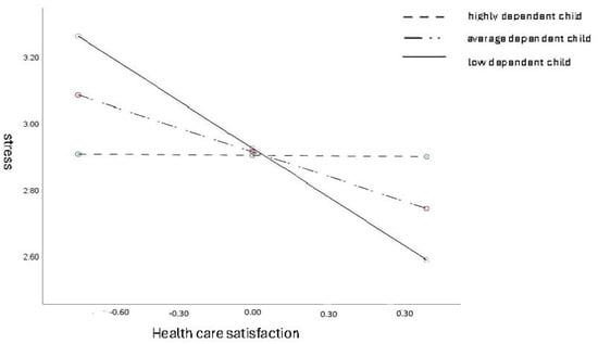In the values of the regression coefficients and Figure 1, it is evident that the association between healthcare satisfaction and stress is the highest for female caregivers with a low-level dependent child (the steepest regression direction) and lower for those with a moderately dependent child. There is no such relationship in female caregivers with a highly dependent child. Those caregivers do not experience lower stress in the event of increased satisfaction with healthcare.
