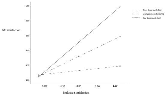 The values of the regression coefficients and Figure 2 show that the association between healthcare satisfaction and life satisfaction is the highest for caregivers with a low-level dependent child (the steepest regression direction) and lower for those with an average dependent child. There is no such association in caregivers with a highly dependent child. Those caregivers do not experience higher life satisfaction in the event of increased healthcare satisfaction.