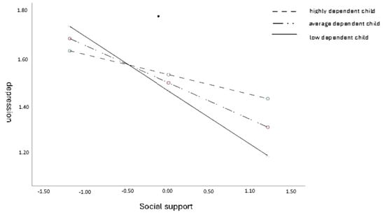 The values of the regression coefficients and Figure 3 show that the association between social support and depression is the highest for female caregivers with a low-level dependent child [the steepest regression direction], lower for those with a moderately dependent child, and the lowest for those with a highly dependent child.