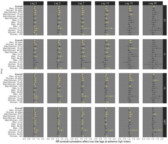 For respiratory mortality, under low exposure levels (Figure 4), robust associations with thermal indices were observed primarily in certain sex/age groups, notably the overall population and elderly individuals, particularly at lags 15 and 20. NET was the only thermal index without a robust positive association. Considering the lag 20, exposures of the overall population (all ages and sexes) to low DI, H, and HI were significantly associated with an increased risk of respiratory mortality, with estimated RRs of 1.26 (95% CI: 1.10; 1.42), 1.26 (95% CI: 1.08; 1.44), and 1.25 (95% CI: 1.11; 1.39), respectively (Figure 4). In contrast, high exposure conditions (99th percentile) were linked to increased risk, particularly at shorter lags such as 3, 5, 7, and 10 days (Figure 5). For example, at lag 5, we observed RRs of 1.31 (95% CI: 1.12; 1.51) for DI, 1.22 (95% CI: 1.11; 1.34) for NET, 1.38 (95% CI: 1.09; 1.68) for H, and 1.31 (95% CI: 1.13; 1.48) for HI (Figure 5).