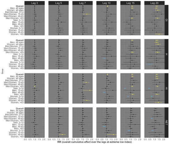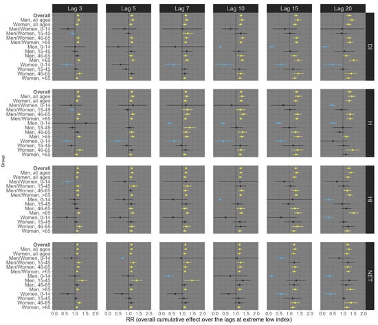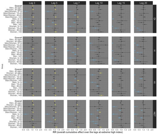 Finally, for circulatory mortality, low exposure conditions consistently showed robust positive associations across nearly all subgroup analyses, with the most pronounced effects observed at longer lags (Figure 6). For example, at lag 20, exposures of the overall population (all ages and sexes) to low DI, H, HI, and NET were significantly associated with an increased risk of circulatory mortality, with estimated RRs of 1.30 (95% CI: 1.18; 1.41), 1.32 (95% CI: 1.19; 1.44), 1.29 (95% CI: 1.18; 1.40), and 1.22 (95% CI: 1.13; 1.31), respectively (Figure 6). On the other hand, under high exposure conditions, robust positive associations were primarily observed at shorter lags (Figure 7). For example, at lag 5, high exposure levels of the overall population (all ages and sexes) to low DI, HI, and NET were significantly associated with an increased risk of circulatory mortality, with estimated RRs of 1.09 (95% CI: 1.02; 1.15), 1.07 (95% CI: 1.02; 1.11), and 1.06 (95% CI: 1.02; 1.10), respectively (Figure 7). Particularly, the thermal index H did not exhibit a robust positive association in these contexts.