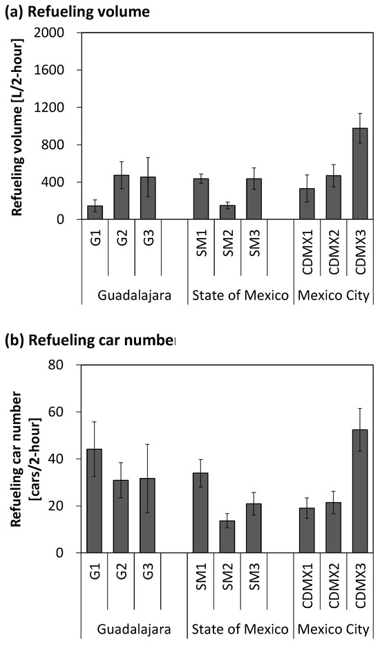 3.1. Refueling Volume and Number of Cars