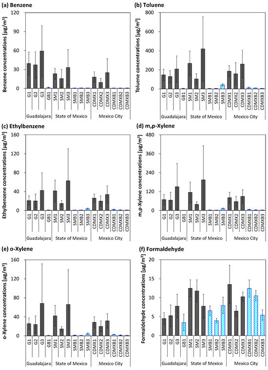 - Ortiz, E.; Alemón, E.; Romero, D.; Arriaga, J.L.; Olaya, P.; Guzmán, F.; Ríos, C. Personal exposure to benzene, toluene and xylene in different microenvironments at the Mexico City metropolitan zone. Sci. Total Environ. 2002, 287, 241–248. [Google Scholar] [CrossRef] [PubMed]