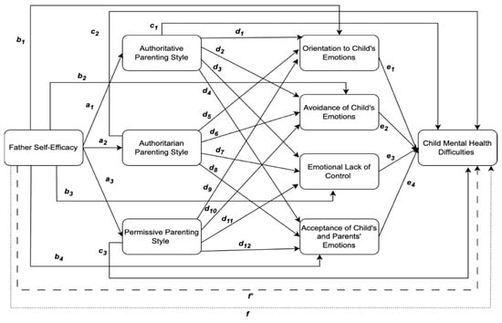 Proposed mixed parallel–sequential model of the relationship between father self-efficacy and child mental health difficulties. Note: The regression coefficients of the different paths in the conceptual model are represented by a1, b1, c1, and so forth. The relationship between father self- efficacy and child mental health difficulties is hypothesised to operate through a direct pathway, shown by the dashed line (f′), and indirect pathways. The indirect pathways are hypothesised to occur through one indirect effect variable—either a parenting style or parent-facilitated emotion regulation variable—or sequentially through two of these indirect effect variables. The total effect of father self-efficacy on child mental health difficulties is shown by the dotted line (f).