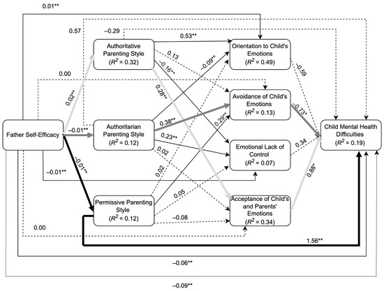 Most of the primary variables included in the model indicated significant moderate–strong correlations, apart from the PERS variables of avoidance of emotions and acceptance of emotions. Greater father self-efficacy was positively associated with authoritative parenting, orientation to emotions, and acceptance of emotions, and negatively associated with emotional lack of control, permissive and authoritarian parenting, and child mental health difficulties. The correlations concerning the PERS measure were surprising, as the acceptance of emotions and avoidance of emotions variables were not statistically significantly correlated with child mental health difficulties.