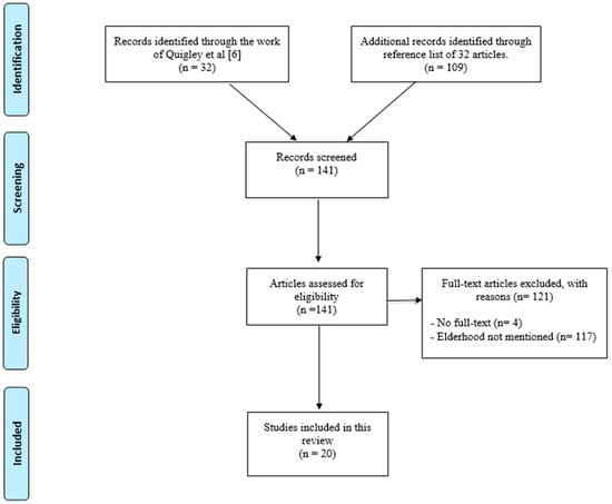 The literature search began with Quigley’s 32 studies and was further expanded by 109 other documents from relevant references cited in these studies. All 141 documents were reviewed in full, and 20 publications met the criteria for inclusion in the review (Figure 1).
