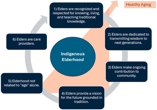 In conclusion, Indigenous definitions of Elderhood are not age-based, nor do they conform to the Western conceptualization of healthy aging as a result of maintaining functional ability [51], or the notion that healthy aging is within reach of anyone who has good physical and cognitive health and stays engaged. In contrast, Indigenous communities believe that an older person must demonstrate commitment to the culture, community, and next generation before being deemed an Elder, and once they are an Elder, they can be said to have achieved healthy aging. The six interconnected themes identified here emphasize the holistic and indispensable role of Indigenous Elders in fostering cultural resilience, intergenerational continuity, and communal harmony. To become an Elder means to embrace this role, and this leads to healthy aging.