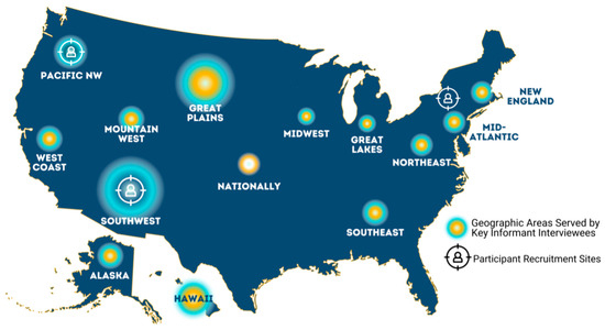 We used both maximum variation purposive and snowball sampling methods to recruit participants in different strata from across the country to participate in this qualitative study [25]. Locally situated, Native, female public health workers or healthcare providers in northwestern Oregon, upstate New York, and north central New Mexico recruited participants for focus group discussions. The participants were adult Native women who had a history of GDM or who have female relatives (e.g., daughters, nieces) between 12 and 24 years old (n = 41), and Native females between 12 and 24 years old (n = 18). Many of these adult and adolescent/young adult females participated in a randomized controlled trial, entitled “Stopping GDM in Daughters and Mothers”, in 2017–2019 [26]. Additionally, the research team recruited key informants with both Western and/or traditional expertise in food, nutrition, food systems, and reproductive, adolescent, and women’s health within Native communities (n = 32) from across the United States to participate in individual qualitative interviews. We used their own professional networks and literature reviews to seek researchers who have published in relevant topical areas and sought guidance from other Indigenous scholars to identify potential expert key informants. The research team sent email invitations to each potential key informant, and, at the end of each interview, asked interviewees to recommend additional individuals who might be interested or whose perspective would be important to include. We also recruited participants for healthcare provider focus groups through a listserv which includes past participants of an annual maternal/child health conference for providers who serve one Southwestern reservation. A map displaying the geographic representation of participants of the areas served by key informants can be found in Figure 1.