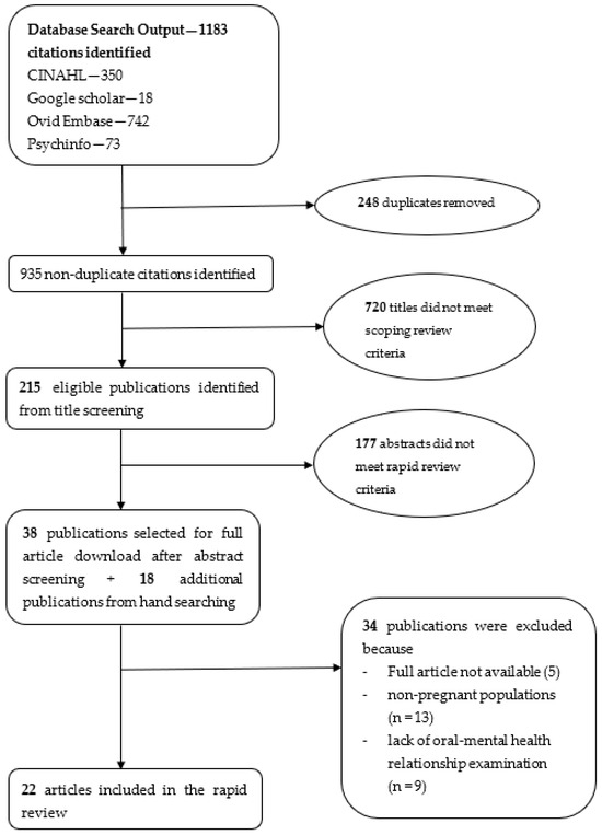 Studies qualified for inclusion by examining pregnant populations at any gestational stage or within one year postpartum and by investigating oral health conditions and specific psychological conditions (anxiety, depression, and stress). Observational studies, including cohort, case–control, and cross-sectional designs, along with interventional studies such as randomized controlled trials and quasi-experimental designs, were included. Furthermore, the team considered systematic reviews and meta-analyses that addressed the research questions. All studies reported quantifiable outcomes in peer-reviewed English-language journals from January 2000 onwards. Studies were excluded if they: (1) focused solely on non-pregnant populations, (2) examined oral health or psychological conditions in isolation, (3) used non-empirical methodologies including qualitative studies, or (4) did not report specific measurable outcomes for both oral health and psychological conditions.