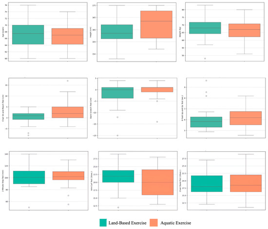 For functional test outcomes, the AE group showed a slightly higher median performance in the Chair Sit-and-Reach Test (2.87 cm vs. 0.27 cm), suggesting better lower body flexibility. However, the LBE group performed marginally better in the Back Scratch Test, with a median of 0.00 cm compared to −1.00 cm in the AE group. These findings align with the expected benefits of land-based exercises for maintaining upper-body flexibility. Similar trends were observed in agility and dynamic balance, with both groups showing comparable performance in the 8-Foot Up-and-Go Test (LBE: 6.03 ± 0.83 s; AE: 6.28 ± 0.83 s), indicating equivalent levels of functional mobility.