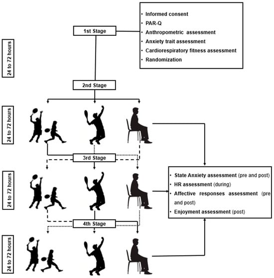 The interventions in sessions 2, 3, and 4 consisted of sessions conducted under three conditions: (a) single session: one-on-one matches, (b) double session: two-on-two matches, and (c) control session: non-exercise. State anxiety symptoms and affective responses were measured immediately before and after each intervention. Enjoyment was assessed only immediately after the beach tennis sessions, and heart rate was recorded throughout all interventions. The outcome measures employed in this study were selected due to their robust validation, cost-effectiveness, and prior cultural adaptation to Brazilian Portuguese, ensuring reliable and accurate assessment within the studied population.