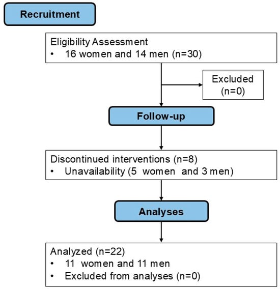 Eight participants did not complete all experimental procedures, leaving a final sample of 22 participants (11 women and 11 men). Figure 2 illustrates the study flow, and Table 1 and Table 2 summarize the participants’ general characteristics and experience with beach tennis.