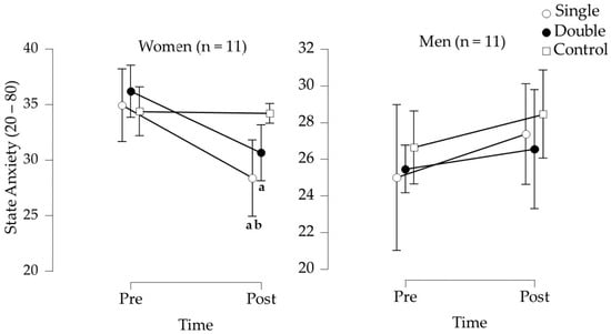 State anxiety symptoms before and after the interventions for women and men beach tennis players. Data are presented as the mean and 95% confidence interval. a Statistically significant difference between pre- and post-intervention. b Statistically significant difference compared with the post control session.