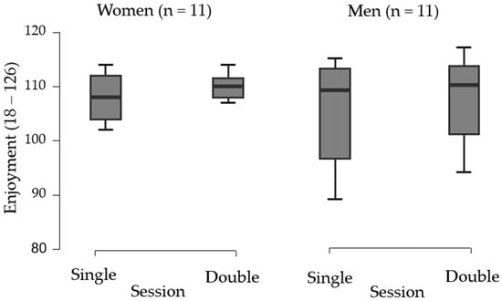 For men, the mean enjoyment scores were 104.1 ± 9.7 (82.6 ± 7.7% of the maximum score) and 106.2 ± 7.7 (84.3 ± 6.1% of the maximum score) during the single and double sessions, respectively. No statistically significant difference in men’s enjoyment was found between sessions (Δ = −2.09; 95% CI, −5.41; 1.23; t(10) = −1.401; p = 0.191; d = 0.165; 95% CI, −1.03; 0.20).