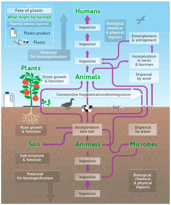 Schematic representation of the flow of plastic in terrestrial environments. How plastic enters into the Earth’s ecosystems and into our food chain [87].