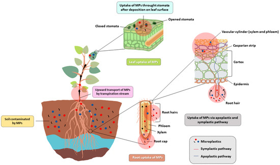 MPs move through the environment in a continuous cycle. They are deposited on the soil surface from the ocean, where they come into contact with plants. From the soil surface, they can flow back into the oceans by wind and rain (Figure 2).