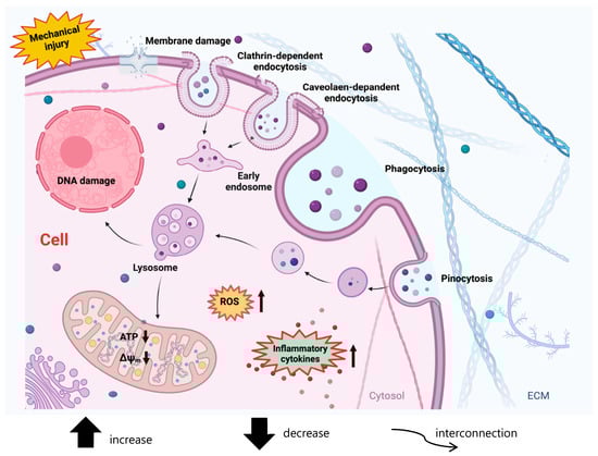 MPs and NPs cell uptake by clathrin-dependent, caveolin-dependent, phagocytosis, pinocytosis, or injury of cellular membrane causes reactive oxygen species (ROS) generation from the mitochondria, an increase in mitochondrial Ca2+, mitochondrial membrane depolarization (↓ΔΨm), increased pro-apoptotic factors, reduction in ATP, and the following production/release of pro-inflammatory cytokines.