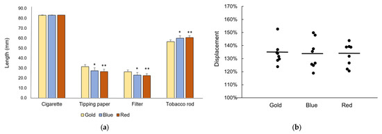 (a) Mean and standard deviation (n = 8 per group) of lengths of whole cigarettes, tipping paper, filters and tobacco rods by color group. Asterisks denote statistically significant difference to gold (* p < 0.05; ** p < 0.01); (b) Percent displacement relative to CM9 reference cigarette tobacco, as an indicator of the presence of expanded tobacco. Lines depict means for each group.