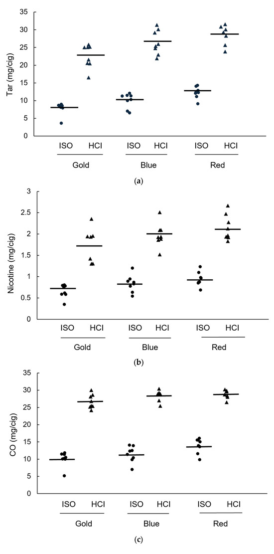 (a) Tar yield per brand; (b) Nicotine yield per brand; (c) CO yield per brand; by color variant group. Each group contains n = 8 brands, measured using the ISO (circles) or HCI protocols (triangles). Lines show the mean for each group, for each protocol.