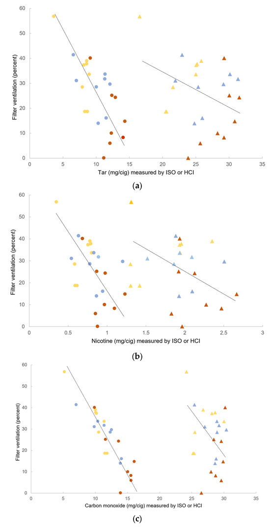 The relationship between filter ventilation and (a) tar, (b) nicotine and (c) carbon monoxide, as measured using the ISO protocol (circles) or the HCI protocol (triangles). Gold, blue and red colors refer to brand variant color. Lines are the regression line from the model, adjusted for other cigarette characteristics (see Table 1).