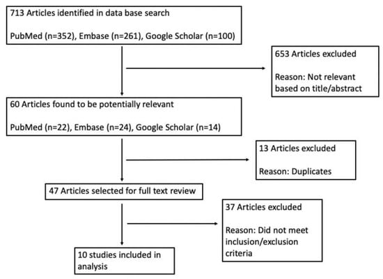A total of 713 articles were initially identified for possible inclusion. Following a review of titles and abstracts, 653 articles were excluded. Of the remaining 60 articles, 13 were excluded as duplicates and 47 were assessed in full-text review. Finally, 37 articles were excluded for not meeting inclusion/exclusion criteria, leaving a final 10 studies to be included in this review (Figure 1).