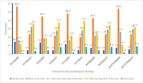 Figure 1 presents a comparison of emotional and psychological feelings reported by study participants before and during COVID-19. The measured feelings include being cheerful and in good spirits (FCGS), calm and relaxed (FCR), active and vigorous (FAV), waking up feeling refreshed and rested (WFRR), and having a daily life filled with things that interest them (DLFTTIM). The data suggest that participants generally experienced a decline in positive emotional and psychological states during the COVID-19 pandemic compared to before the pandemic. The notable reduction observed in feelings such as cheerfulness, calmness, activeness, and interest in daily life highlights the pandemic’s significant impact on mental well-being.
