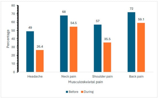 The prevalence of different types of musculoskeletal pain (MSPP) reported by participants before and during the COVID-19 pandemic is given in Figure 2. The data indicate a general decrease in the prevalence of musculoskeletal pain (headache (49% versus 26.4%), neck pain (68% versus 54.5%), shoulder pain (57% versus 35.5%), and back pain 72% versus 59.1%)) during the COVID-19 pandemic compared to before. The most significant reduction was observed in headache and shoulder pain, while neck pain and back pain also showed notable decreases, although to a lesser extent.