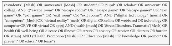 The rapid review followed the eight-step process outlined by Khangura et al. [15] to produce an evidence summary of digital educational escape rooms in stress management. Step 1 is the needs assessment. The research topic was derived by the research associates from the needs and problems of the target group based on the literature. It was defined during the pilot study conducted with Master’s course students as the target group. In Step 2, the research question was developed and refined. An initial exploratory search was carried out. As it became apparent that there was a lack of literature on digital educational escape rooms in stress management for students, the research question was extended in terms of the promotion of health and well-being. Step 3 includes the proposal development and approval. As the research project was not financially supported by a sponsor, no research proposal had to be prepared. In Step 4, the search strategy was developed, and a systematic literature search was conducted. We searched PubMed, Scopus, Psyndex, and ERIC. Table 1 shows the selected search terms according to the PICO approach (population, intervention, comparison, outcome) [16]. Boolean operators were used. The search string is shown below in Figure 1 exemplarily for the database PubMed.