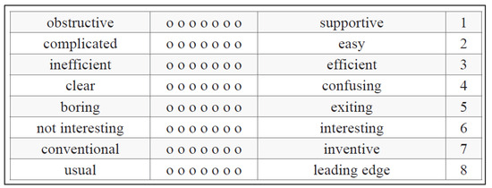 - The short form of the user experience questionnaire (UEQ-S): Each item of the UEQ-S consists of a pair of terms with opposite meanings (see Figure 2).