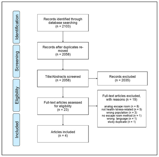 The database search yielded 2103 articles, of which 45 were duplicates. Of the remaining 2058 articles, their titles/abstracts were screened. This resulted in 23 articles eligible for full-text screening. From these, 19 articles were excluded because the escape room was analog (n = 8), the study did not focus on health- or stress-related outcomes (n = 5), it was a wrong study population (n = 3), it had no escape room method (n = 1), it was in another language (n = 1), or it was a study duplicate (n = 1). Hence, a total of four articles were included. The PRISMA flowchart [34] is shown in Figure 3. The data extraction chart is provided in Table 3.