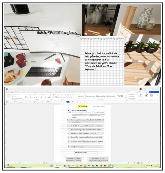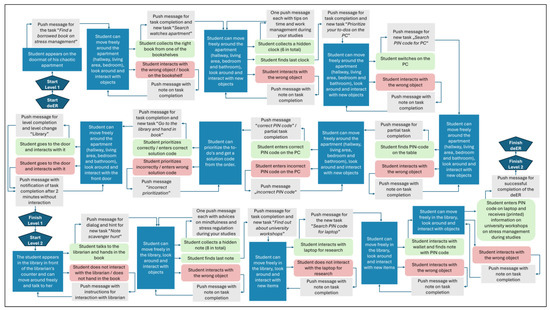 In this step, players’ motivations, game stories, and content were considered to create an engaging game experience for the intended players. The escapeED framework proposes to develop the theme of an escape room [19]. In this context, we chose a narrative design for the game to keep the players interested. To make the theme more engaging and realistic, the prototype was based on a fictional story that reflects a student’s everyday life during exam time when they are faced with more stress. As both levels took place in different virtual spaces (level 1 in the student’s premises and level 2 in the library), the two levels were linked by a storyline. Additional tasks were developed for this purpose (e.g., the search for a library book that must be returned). Also, the tasks in the individual levels were linked by further tasks (e.g., searching for a borrowed book from the library). The game ends when the student playing is asked to leave the library to meet up with friends after successfully learning. Finally, a script with the most important information from the entire deER can be downloaded from the laptop in the library.