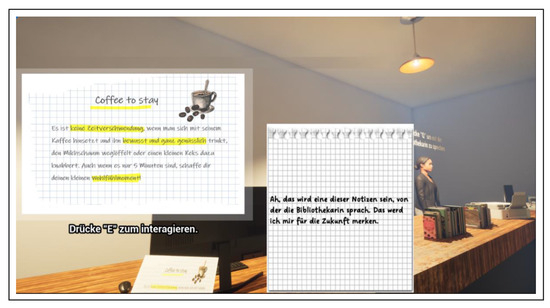 First, the players should decipher various aspects of time management to experience playful progress in the deER. Overall, the integration of rewards contributed to successful time management, whereby wasting time was declared a challenge. The design of the deER was based on a realistic learning environment for the players. Accordingly, the first level was designed in the style of a student-rented apartment, which is filled with learning materials and everyday objects to represent the student’s place of learning. The second level was designed in the style of a university library. A librarian has been integrated there, allowing interaction and introduction to the level and the puzzles it contains. The integrated puzzles are number puzzles, jigsaw puzzles, as well as search and solution tasks. The solutions to some tasks provide a didactic learning component that reflects how to deal with stress using mindfulness exercises that reflect the behavior of the players and create space for reflection. Furthermore, the interaction with objects such as a laptop provides a digital component, which shows the offer of the institution in the context of stress management to solve the deER. Concurrently, this offer is made available to the players in analog form to create added information value for future interests. The following figures provide an insight into the German-language version of level 1 (see Figure 5 and Figure 6) and level 2 (see Figure 7 and Figure 8).