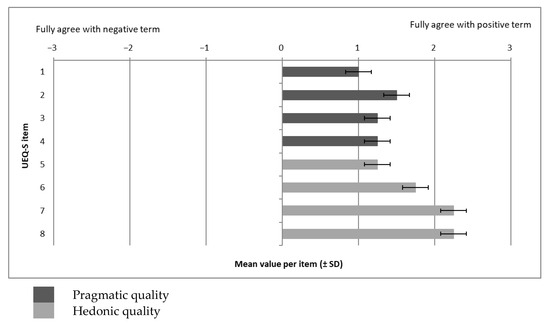 Participants are supposed to rate each item on a 7-point Likert scale. The answers are scaled from −3 (fully agree with the negative term) to +3 (fully agree with the positive term). The first four items represent the pragmatic quality scale, and the last four items represent the hedonic quality scale. Values > 0.8 represent a positive evaluation, and values < −0.8 represent a negative evaluation [28]. For details concerning the design as well as validation of the UEQ-S, see [29,30]: