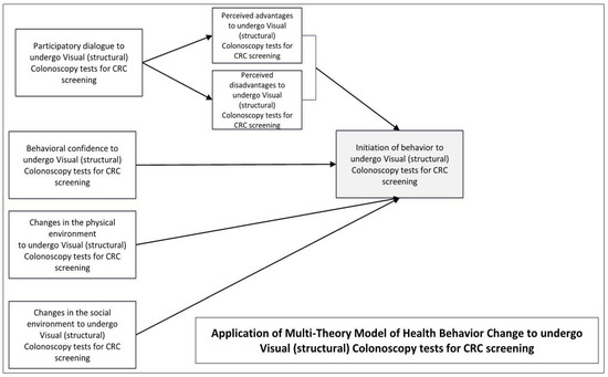 This study resonated with the constructs of the modified framework of the multi-theory model (MTM) of health behavior change to explain the correlates of visual CRC screening examinations and initiation of screening tests for CRC among individuals aged 45–75 years. Particularly, the constructs of participatory dialogue and changes in the physical environment along with age, recommendations from healthcare providers, and previous experience with visual CRC screening were found to be significantly predictive of the decision to initiate any visual CRC screening examination as a screening test. Before engaging in intervention research, researchers should undertake a mixed-methods approach and reiterate the findings using the MTM.