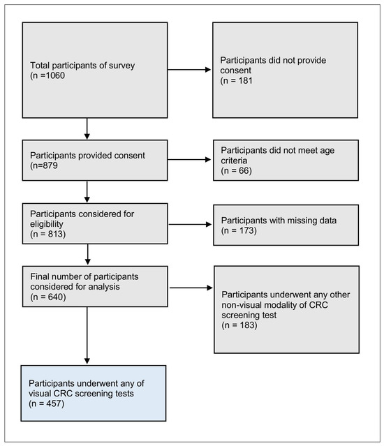 A total of 1060 individuals were invited for the survey, but 139 (13.11%) left the informed consent blank, 42 (3.96%) did not provide consent, 11 did not meet the age criteria, 55 (5.18%) had missing age information, 39 (3.67%) did not complete the survey, and 134 (12.64%) participants had missing information about CRC cancer screening (Figure 2). The final sample (n = 640) had less than 5% of the missing values on variables of interest which were the demographics, personal and family history of Crohn’s disease, history of non-stool-based CRC screening test (flexible sigmoidoscopy, colonoscopy, computed tomography (CT) colonography or virtual colonoscopy), and the likelihood of getting a visual screening test for CRC.