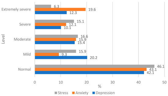 The results of the depression, anxiety, and stress scales revealed that over 50% of students experienced emotional pressure ranging from mild to extremely severe every day (Figure 2).