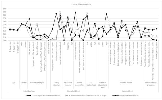 The aim of this study was to explore clustered child and family demographics of 0–12-year-old children from two Dutch urban cities, The Hague and Leiden, and the associated social and physical environmental exposures, health, and healthcare utilization. Using LCA, we identified three distinct classes: ‘Dutch-origin two-parent household’, ‘households with diverse countries of origin’, and ‘single-parent household’. Each family type was found to possess its own specific characteristics that distinguished it from the others. Differences were also found in terms of social and physical environmental circumstances, and the children in each class presented differences in health outcomes, healthcare utilization, and healthcare costs. These differences highlight potential protective and risk factors for health outcomes.
