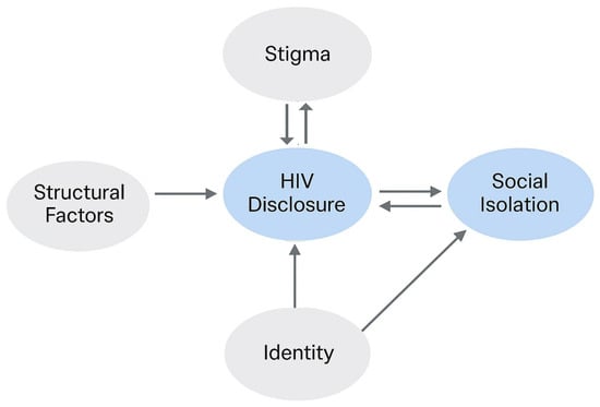 Conceptual framework illustrating how HIV disclosure is shaped by identity and structural factors, and how it, in turn, affects and is affected by social isolation. Arrows indicate hypothesized directions of influence.