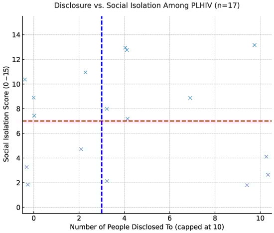 The scatterplot reveals substantial heterogeneity: participants with high disclosure appear across the full range of social isolation, and those with low disclosure also report both low and high isolation. In other words, greater openness about HIV status does not consistently predict either a lower or higher social burden in this sample.