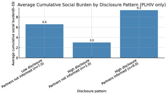 Among the 17 PLHIV, participants who disclosed broadly and informed their sexual partners () reported the highest average cumulative burden (mean out of 15 possible indicators). Those who disclosed to fewer than three individuals and did not inform partners () reported a lower mean burden (mean ). Only one participant disclosed widely but did not inform partners (, mean ). No participants reported low overall disclosure while informing their partners.