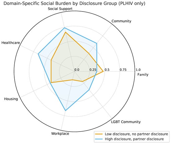The radar plot highlights considerable variability across social domains. Participants in the Low Disclosure, No Partner Disclosure group reported a higher or comparable average burden in many domains, particularly in family-related exclusion, although they reported a lower burden in the workplace and community. By contrast, participants in the High Disclosure, Partner Disclosure group reported a somewhat greater burden in healthcare-, community-, and workplace-related items. However, given the small sample size and uneven subgroup counts, these differences should be interpreted cautiously.