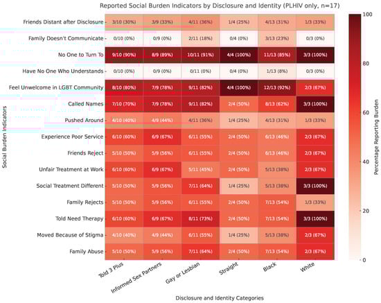 Under both thresholds, participants identifying as White () who disclosed widely and informed partners reported the highest levels of burden: 100% reported being called names, 50% reported family rejection, 100% reported workplace unfairness, and 100% reported having moved due to stigma. Black participants with similar disclosure patterns () also reported elevated burdens but at slightly lower levels: 67% reported being called names, 67% reported family rejection, and 33% reported having moved due to stigma under the main threshold.