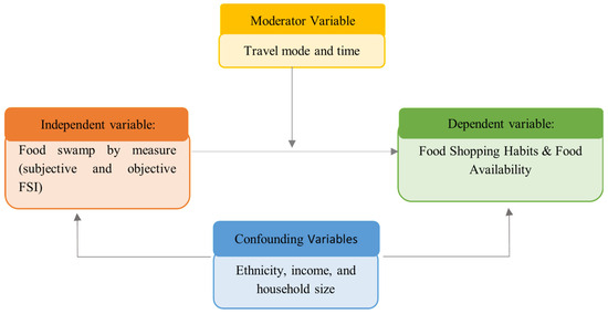 Poisson regression models examined associations between individual-level Food Swamp Index exposure and three outcomes: (1) shopping frequency at unhealthy food outlets, (2) perceived access to healthy food, and (3) perceived access to unhealthy food. Separate models were estimated for objective and subjective Food Swamp Index scores. Additional models included interaction terms to test whether transportation mode and travel time moderate the relationship between food swamp exposure and outcomes. The framework for the regression model is illustrated in Figure 3.