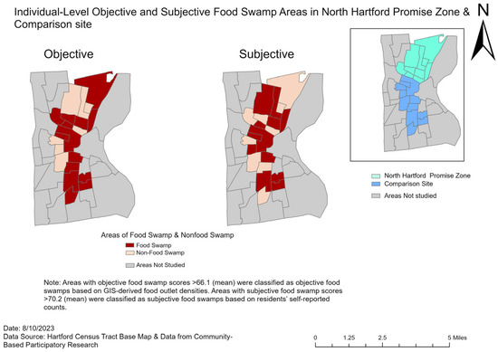 Objective Food Swamp Index: Food store locations from the FS-EAT audit and resident survey data were geocoded into point data in ArcGIS Pro (version 10.4.1). The residents’ survey data points were then spatially joined to the Hartford census block group. The category of food store points from the audit data was then symbolized with basic colors and overlaid on the spatially joined Hartford base map. A 0.5-mile buffer was generated around each participant’s home address, and the number of food stores falling within each buffer, by category, was counted and assigned to each participant.