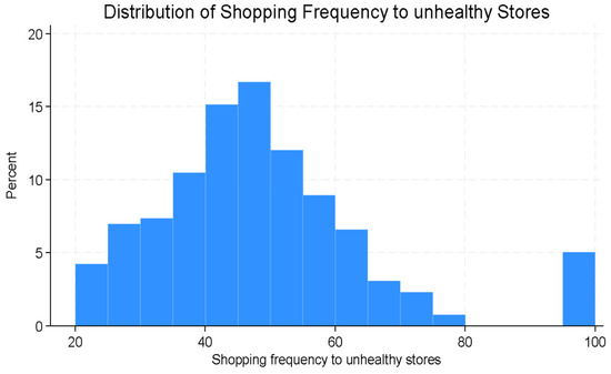 Composite scores ranged from 20 to 100 and were analyzed as a continuous variable, with higher values denoting more frequent shopping at unhealthy stores.