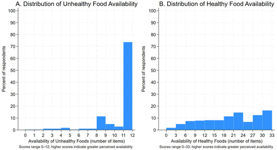 Food types were grouped as healthy (fruits and vegetables, dairy, whole grains, cultural food, and water) and unhealthy (junk food, fast food, and sugary drinks). Composite scores for the availability of each food category were generated by summing participants’ responses for all foods in each category. Participants missing responses for any food types were excluded from the respective composite (n = 21 for healthy foods, n = 10 for unhealthy foods). Composite scores for healthy food availability ranged from 0 to 33, and unhealthy food availability ranged from 0 to 12, with higher values denoting greater perceived availability.