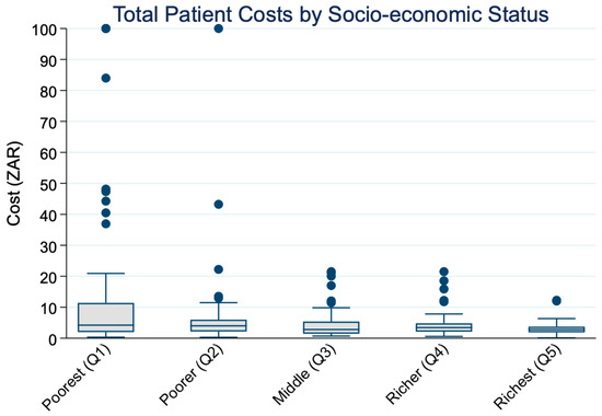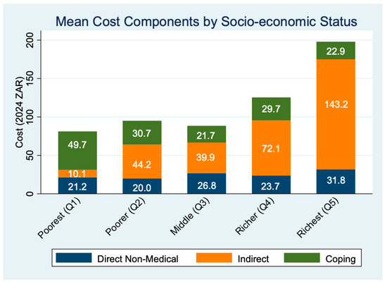 Figure 1 shows that mean total costs increased with SES, from ZAR 81.07 in Q1 to ZAR 197.93 in Q5, primarily due to rising indirect costs (from ZAR 21.19 in Q1 to ZAR 175.01) in Q5. On average, participants reported 47.6 min of travel time and 2.3 h of waiting per clinic visit, underscoring the time burden of accessing care.