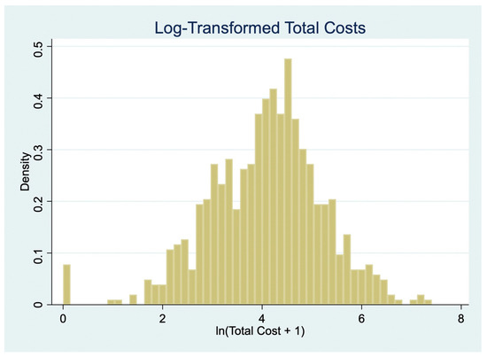 Cost data were highly right-skewed, a common feature of patient-incurred cost datasets [16]. To account for this, we applied log-transformation of cost variables as a standard normalization technique in health economics. However, our primary regression analyses employed GLMs with a gamma distribution and log link, which directly accommodate skewed, non-negative cost outcomes without requiring transformation of the dependent variable [17,18,19]. The log-transformed variables were retained only for sensitivity analyses using ordinary least squares (OLS) regression.