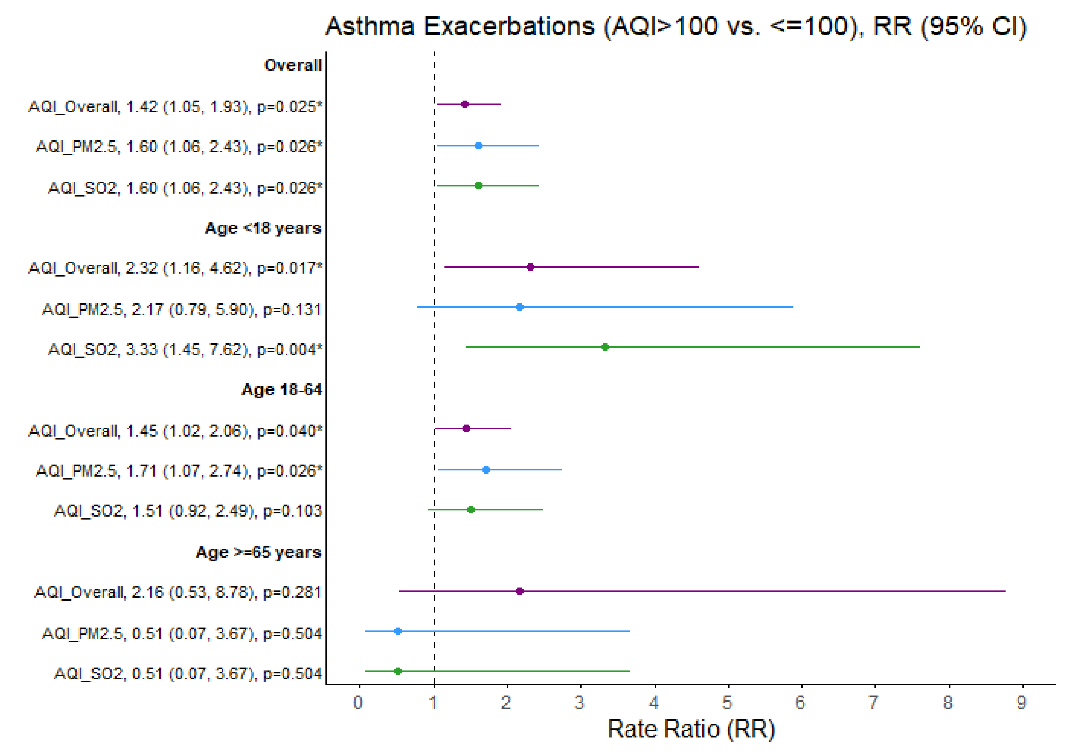 This analysis focused on overall AQI exceedances (>100), with PM2.5 and SO2 identified as the primary contributing pollutants. An association between exposure to unhealthy air quality and the risk of asthma exacerbations within the same day was identified (Table 3).